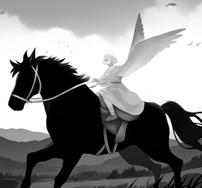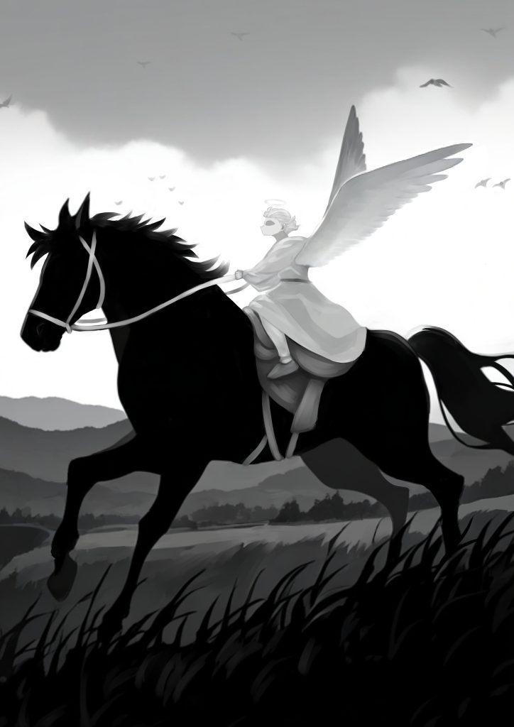 - 乗馬する天使を描写したイラスト