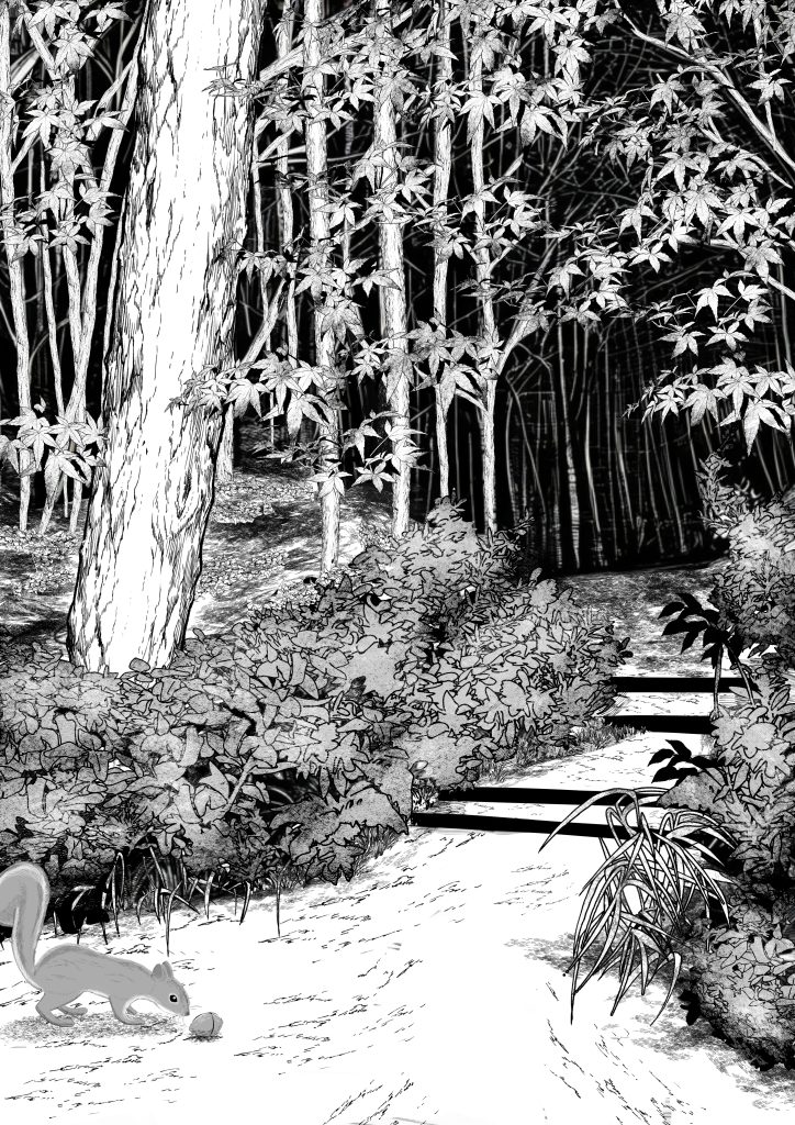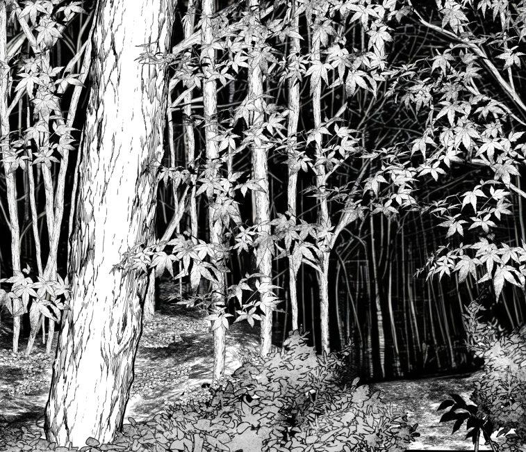 • 木々や地面など漫画的表現を意識して描きました。