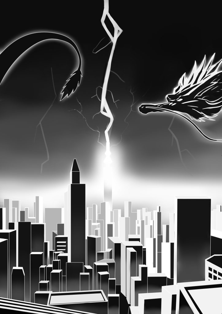 - 一番高い建物に落雷を落とす龍を描写したイラスト