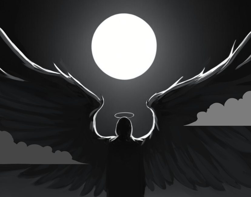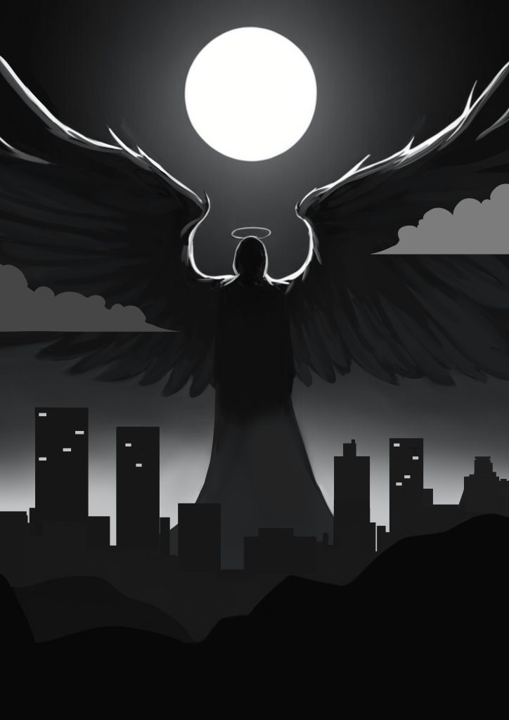- 満月の夜に巨大な天使が佇む姿を描写したイラスト