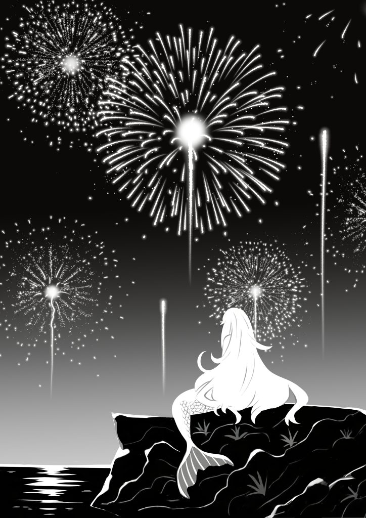• 広大な海と夜の黒、儚い花火と人魚の白で対比することを意識して描きました。